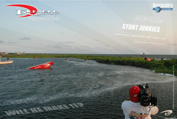 The Discovery Channel was recently spotted filming at REAL Kiteboarding in Cape Hatteras, North Carolina. They were here July 17-21st filming an episode of Stunt Junkies, featuring the sport of kiteboarding and REAL team member Jason Slezak. For those of you that are not familiar with the show, Discovery basically writes a blank check to let the top athletes in the world attempt their wildest dream stunts!