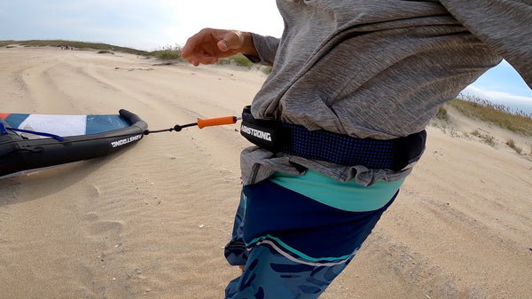 A lot of advanced wing surfers really like to use the inflatable wing waist leash because that will free up both arms for paddling out through the surf. To compliment the wing waist leash, most riders are using some sort of ankle or calf leash.